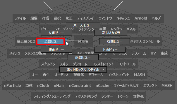 ・カーソルをホットボックス中央 [Maya] 上で、左ボタン長押し > [上面ビュー] を選択する。
