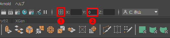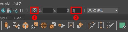 ピボットポイントが移動Z 2 の場所に移動します。[絶対トランスフォーム] の場合 [入力フィールド] X:□ Y:□ Z:□ に入れたワールド座標へ移動します(ピボットポイント以外のオブジェクト等でも移動します)。