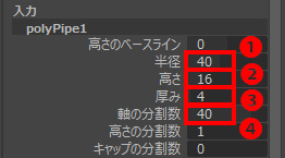 ・[半径]❶ に 40、[高さ]❷ に 16、[厚み]❸ に 4、[軸の分割数]❹ に 40 を入力。