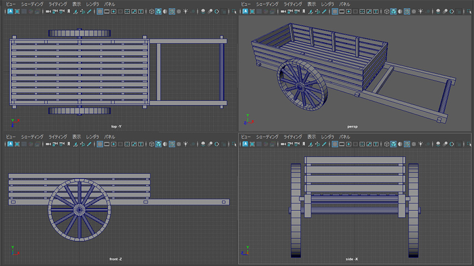 車輪を活用して、荷物を運ぶ荷車を作成しましょう。チャネルボックスの数値入力による操作や、特殊な複製等を用いてモデリングします。下図を参考にして下さい。