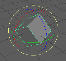 回転ツールの初期設定はオブジェクト座標です。ワールド座標に変更して回転のマニピュレーターの操作を確認します。