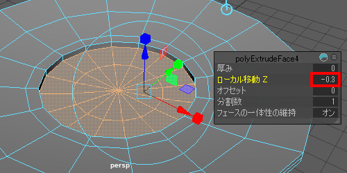 ・[押し出し] のオプションウィンドウで、[ローカル移動Z] に -0.3 を入力。