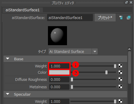 ・[ブラウザ] で [aiStandardSurface2] が選択されているか確認。