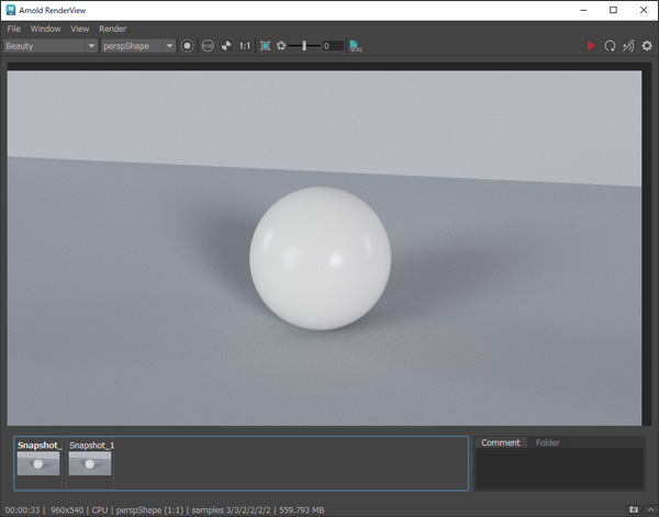 ・Arnold RenderView右下の[Store a Snapshot]ボタンを押して比較用に画像を仮保存する。