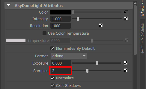 ・aiSkyDomeLight1 を選択し、アトリビュートエディタの [Samples] に 3 を入力する。