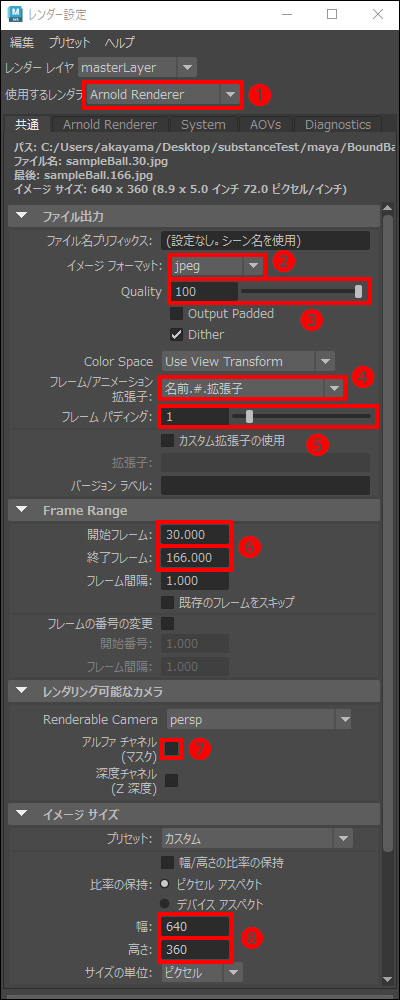 ・[使用するレンダラ] は [Arnold Renderer] を選択❶。