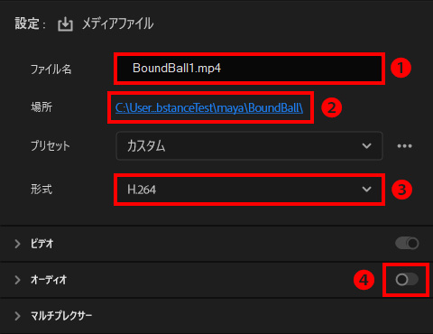 アニメーションを連番ファイルで出力し、Premiere等の編集ソフトで読み込むことができるようにします。レンダリングの前に、各種設定を行います。