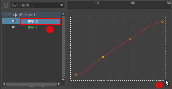 ・カーブの谷となる45フレームと60フレームのキーを囲って選択❷。